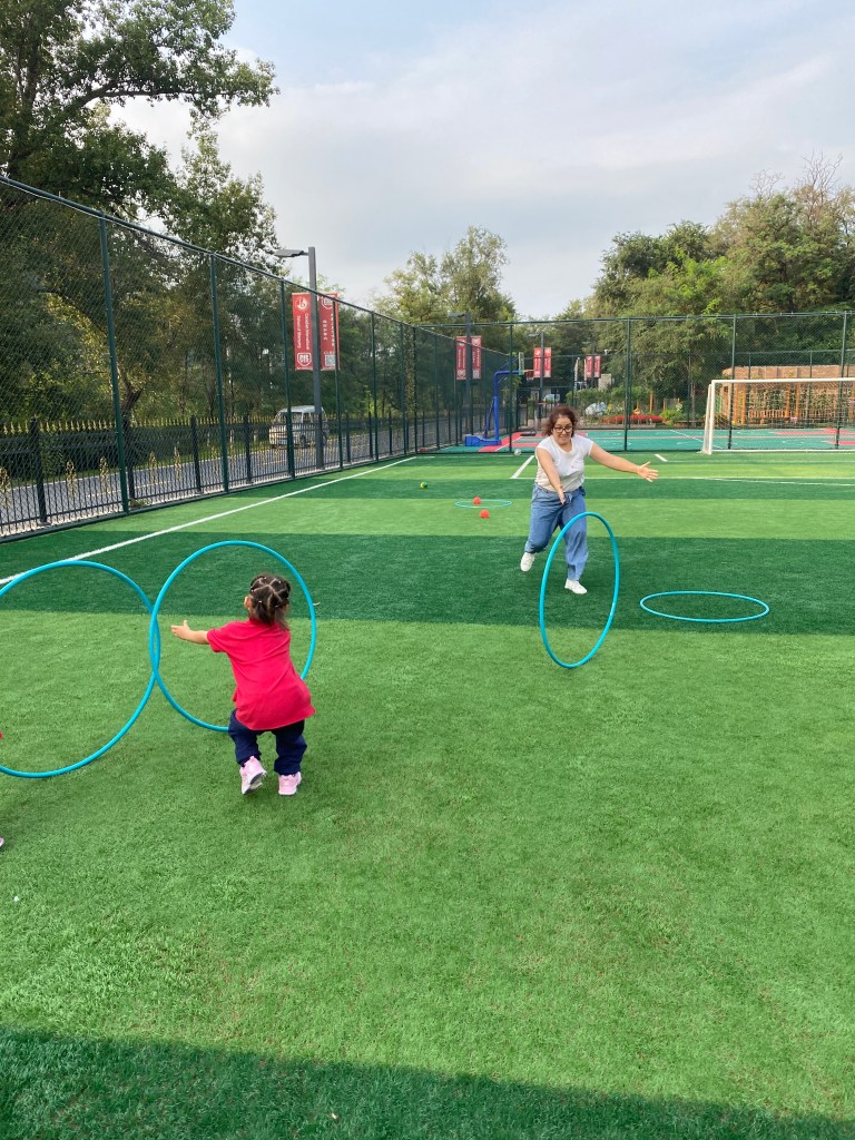 Let me show you an example: Elsa learning how to throw the hula hop. She is having fun, practising balance and strength, practising vocabulary and physics (how far can it go if I use more strength?).