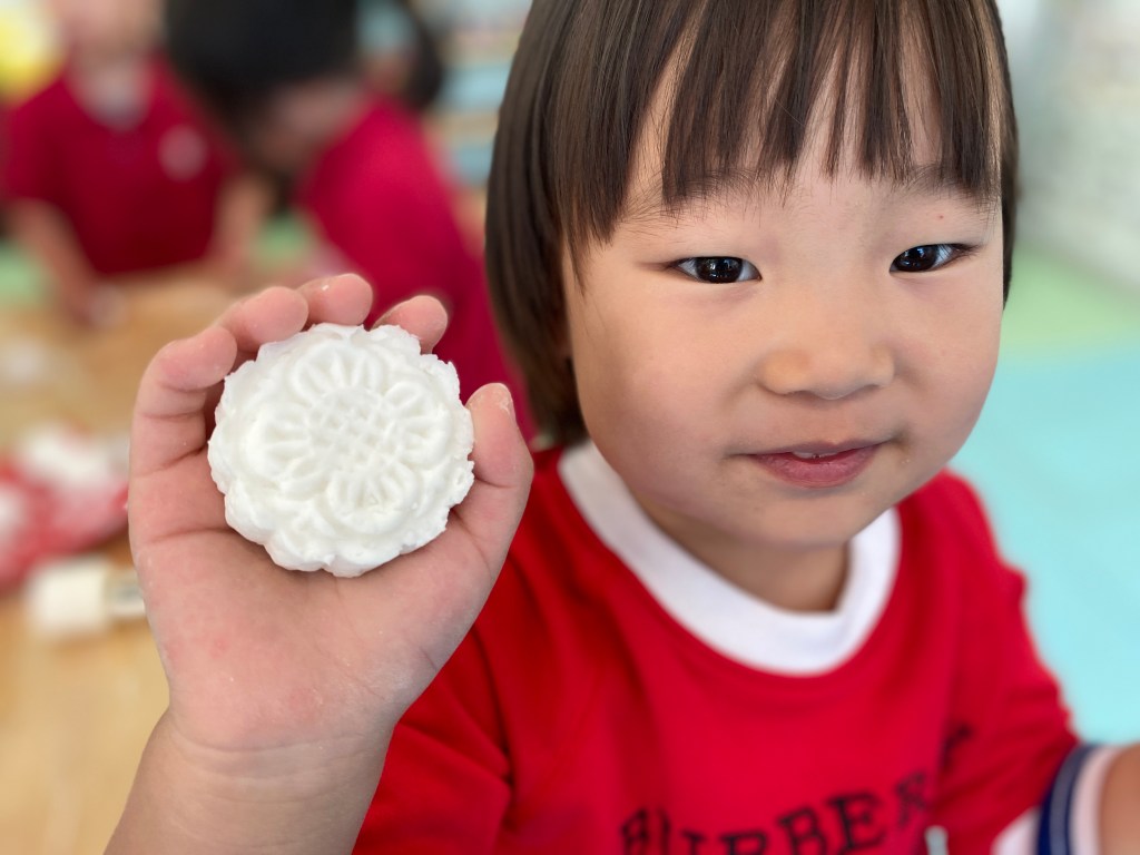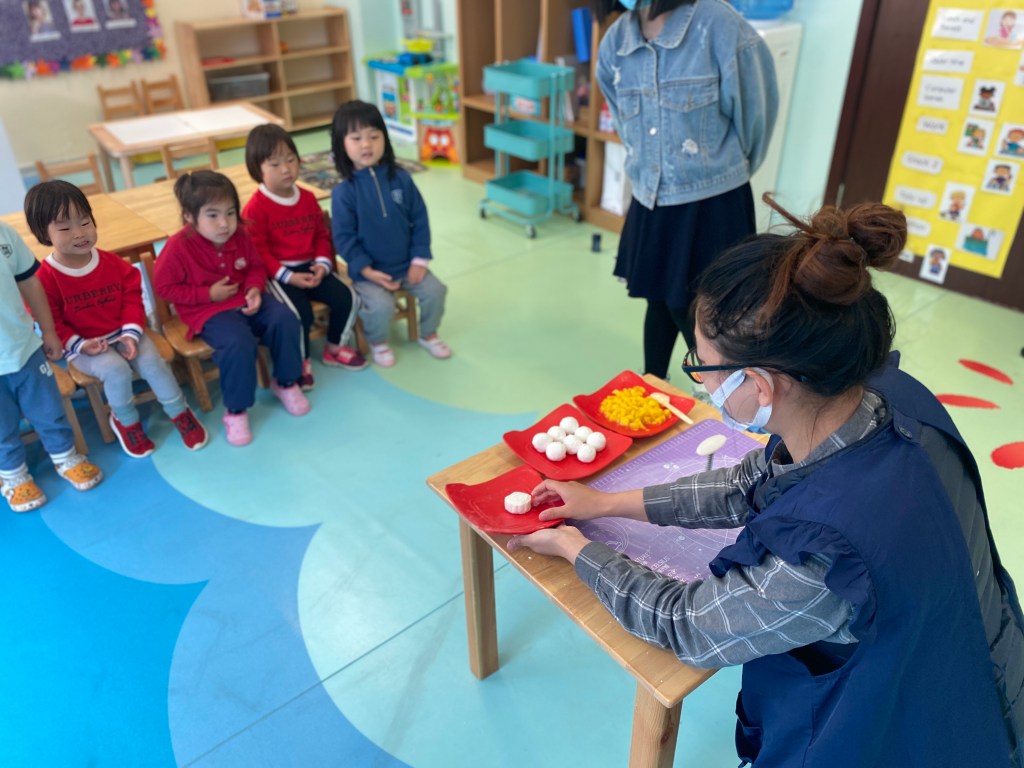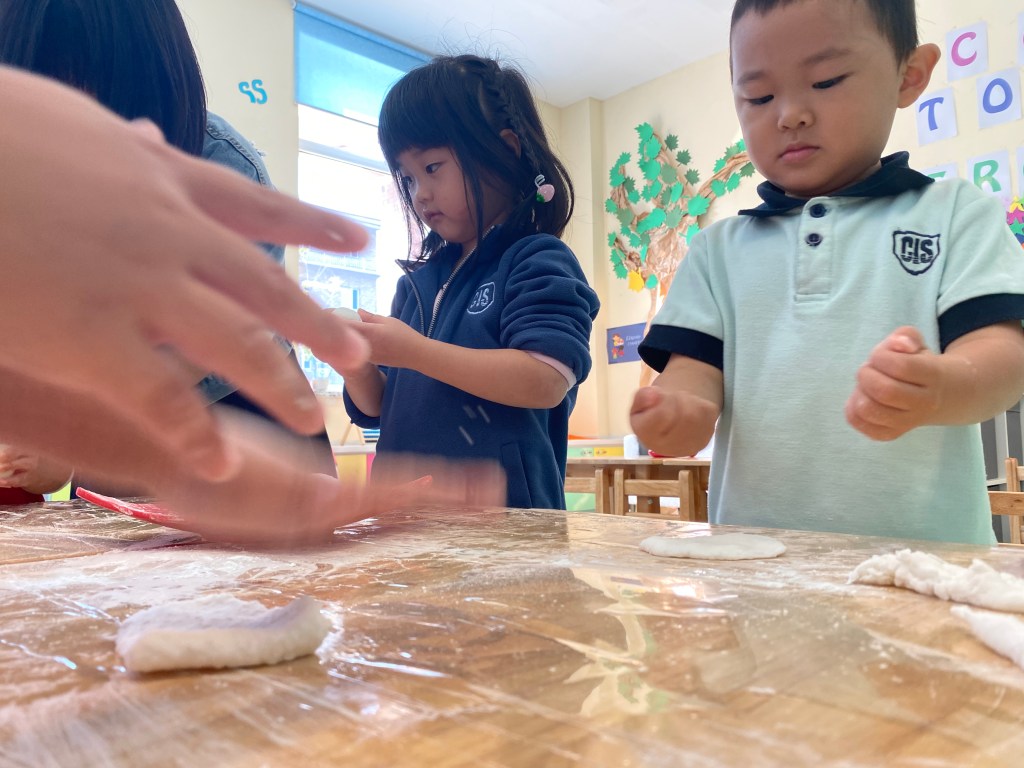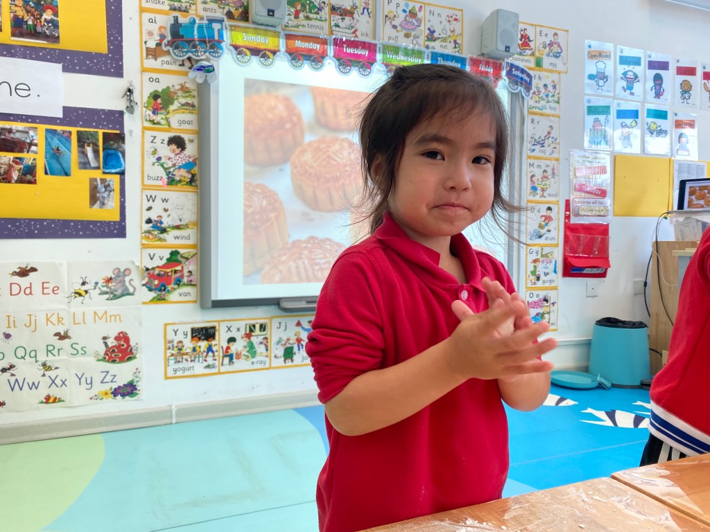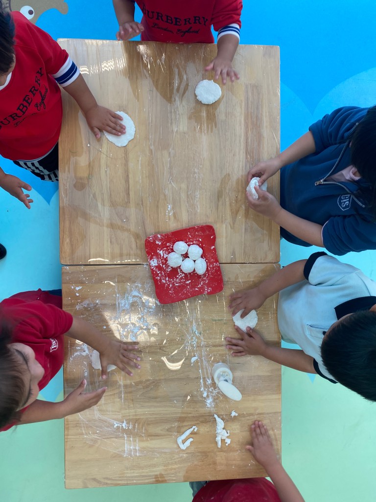 The next day we did our second interdisciplinary activity: we brought a bit of China to our class and with the help of teacher Beryl we made mooncakes, the typical sweet of these holidays. A sweet that is also round! That is why we started the class with the song of the shapes. While we were singing Teacher Beryl lovingly prepared all the ingredients. The kids loved having a special dough (that we didn’t eat) to play with and knead. They felt very big and autonomous helping teacher Beryl! Look at their faces!