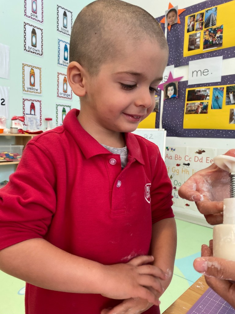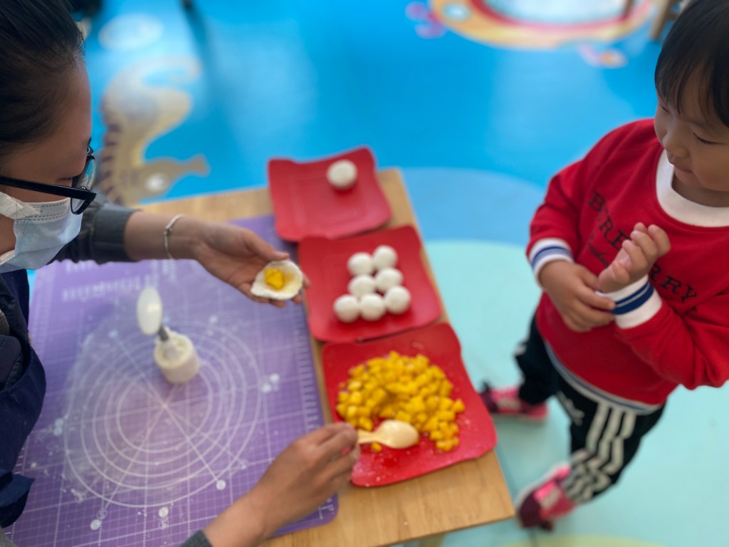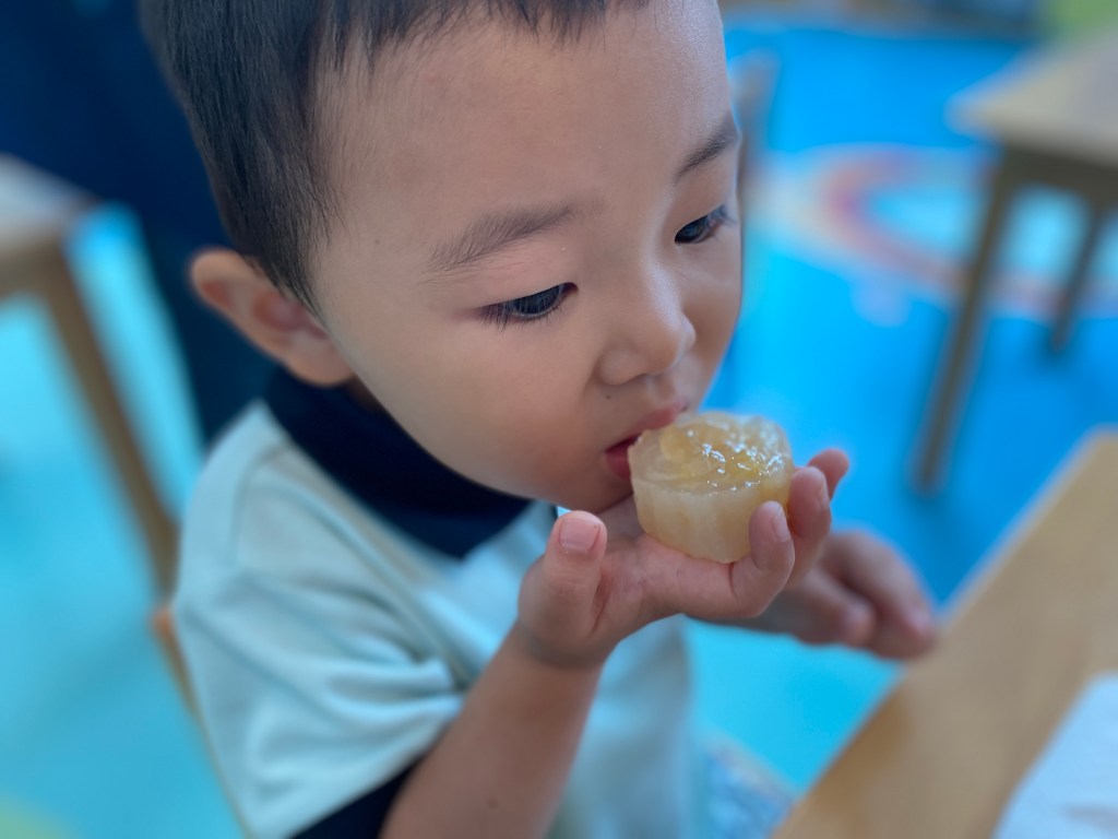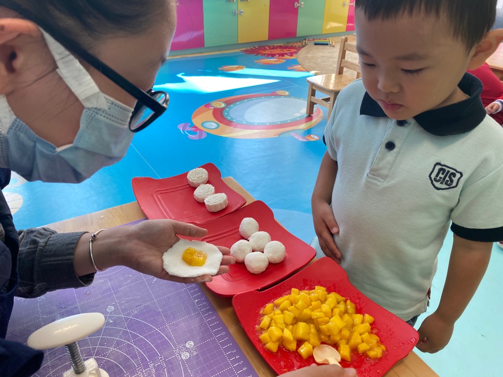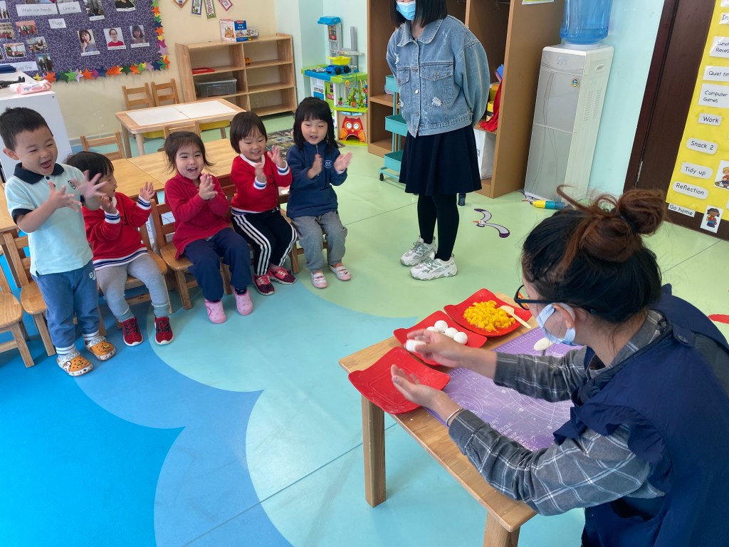 The next day we did our second interdisciplinary activity: we brought a bit of China to our class and with the help of teacher Beryl we made mooncakes, the typical sweet of these holidays. A sweet that is also round! That is why we started the class with the song of the shapes. While we were singing Teacher Beryl lovingly prepared all the ingredients. The kids loved having a special dough (that we didn’t eat) to play with and knead. They felt very big and autonomous helping teacher Beryl! Look at their faces!