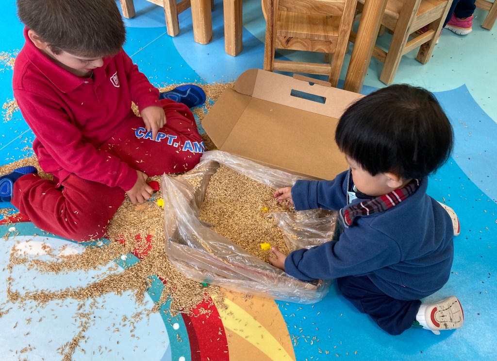 They also test us by wondering different questions: “Can I or can’t I continue investigating? Are my advances valued or censored? Will my parents let me try three more times? Why can I experiment with certain objects and not with others?” It doesn’t matter what you decide, just keep in mind that children learn very early that gravity exists. It would be a shame to forbid them to make such a discovery … At school, it is the same, the environment in the classroom is a kind of laboratory. Children explore the materials and use them in ways you cannot imagine.