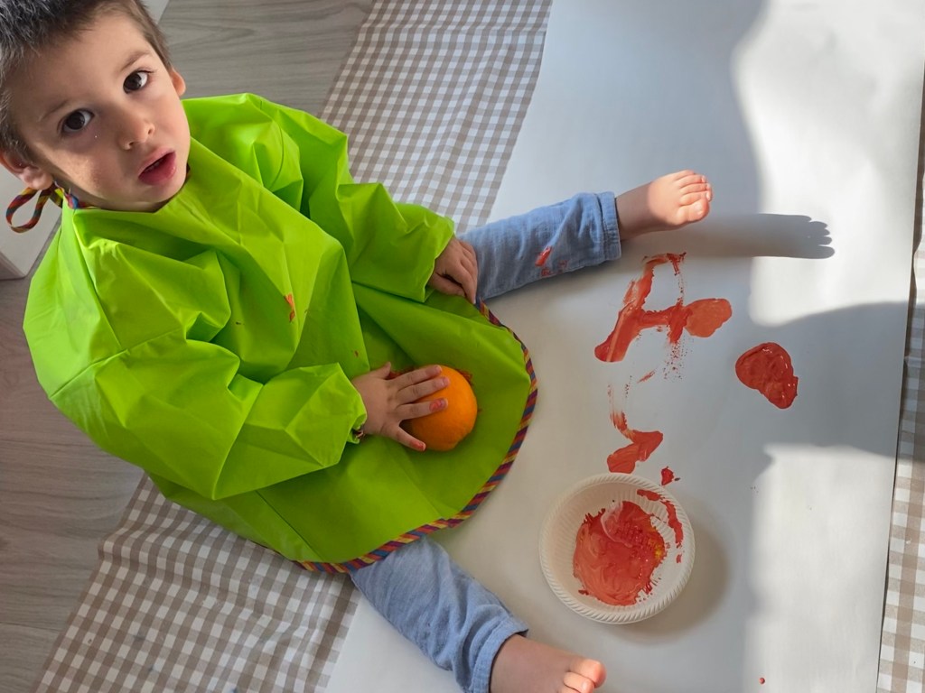 Choose some fruits with your child. Talk to them about the shape, the colour, how they smell… and then use them to paint! In the picture, you can see the child stamping with an orange. When you stamp, you can see the colour and the shape (in this case, orange and a circle). But you can play and paint more things. It is also is very nice to use a potato, because you can cut it and make any shape inside. Here you have a video to see how to stamp with potatoes.